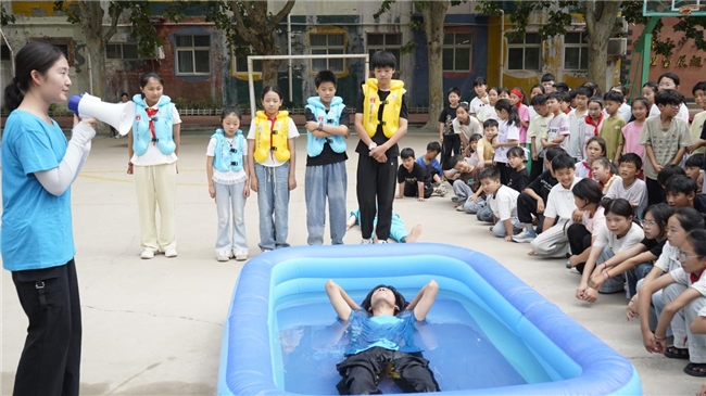 夏日炎炎,暑期将至,青少年溺水事故进入高发期。为筑牢校园安全防线,织密暑期防溺水“防护网”,6月23日,仁智书院“模拟池塘 防溺先锋”应急救护社会实践团15名医学生奔赴马庄完全小学,开展了一场别开生面、寓教于乐的防溺水安全教育社会实践,为全校200余名师生送上了一份干货满满的“暑期安全大礼包”。