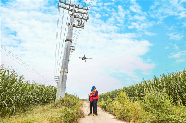 国网香河县供电公司安平镇供电所员工正在开展无人机巡检工作,保障秋收期间的电力供应安全。(王爱华 摄)
