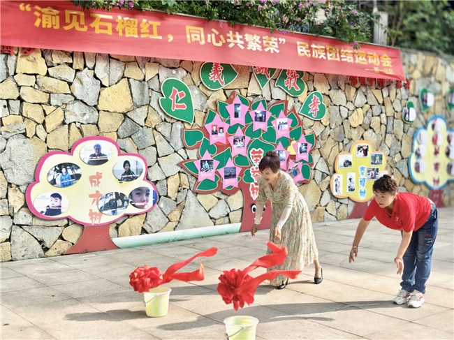 为推动民族团结进步深入人心,弘扬中华优秀传统文化,促进各民族交往交流交融,增强居民体质,营造和谐健康的社区氛围,9月28日,作为“重庆市社会体育指导员健身指导示范点”的大渡口区新山村街道新一社区在文化广场开展了“渝见石榴红,同心共繁荣”民族团结趣味运动会,吸引包括少数民族居民、志愿者在内的80余人共同参与。