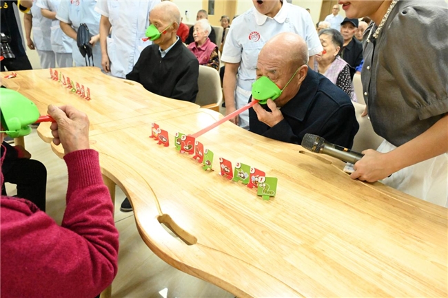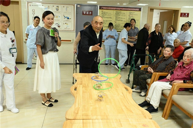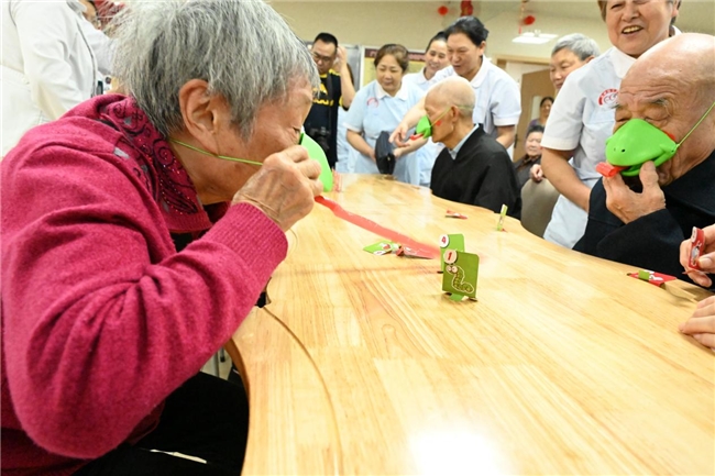 游戏互动环节将活动推向了高潮。“舌尖上的蛙式舞蹈”考验着爷爷婆婆们的反应与协调,滑稽的动作引得大家开怀大笑;“玉环套月”趣味套圈区排起了长队,他们全神贯注,每当套中目标,便引来一片欢呼;而“银龄风采”拉气球大战则在一片欢声笑语中展开,清脆的气球爆破声与老人们的笑语交织成一曲快乐的乐章。