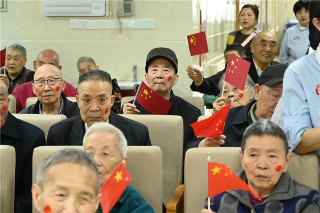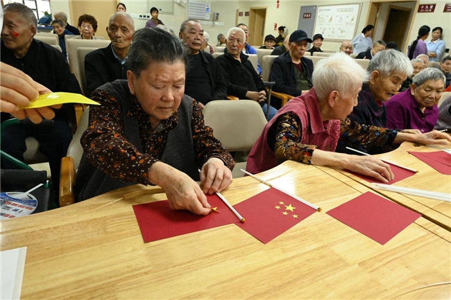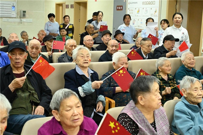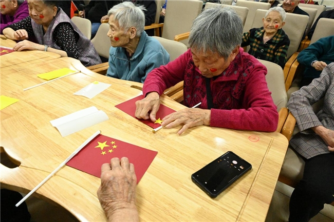 手工“巧手绘赤心”时,爷爷婆婆们在家属和工作人员的协助下,认真地制作着一面面小红旗。他们用双手传递着对祖国最纯真的热爱,每一面红旗都凝聚着他们的赤子之心。