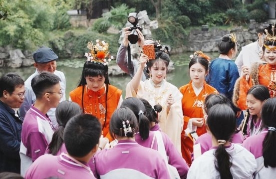 本次活动的最大亮点在于创新推出的实景沉浸式互动演绎“红楼游园会”。来自中国艺术研究院研究生院、江苏省锡山高级中学的40名参与者化身“红楼梦中人”,在锦绣园的亭台楼阁间开启了一段奇妙的文学之旅。