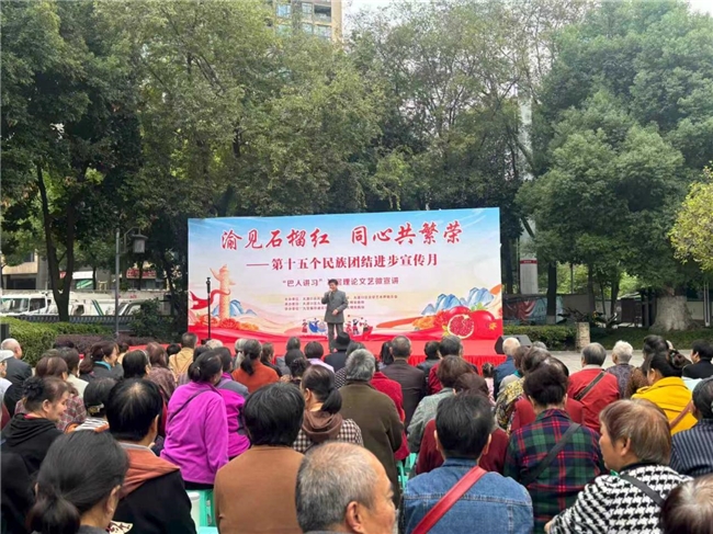 为充分发挥新时代文明实践所理论传播主阵地作用,10月24日,重庆市大渡口区九宫庙街道新时代文明实践所深度融合“巴人讲习”文艺微宣讲形式,以群众喜闻乐见的文艺形式,举办了“渝见石榴红 同心共繁荣”主题宣讲活动。