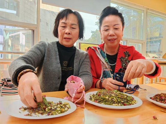 学习结束后来到香囊制作环节。社区志愿者先为大家讲解了制作香囊的材料和功效等知识,并引导他们将中药装进香囊内。不一会儿,一个个承载着安康与祝福的香囊便制作完成。