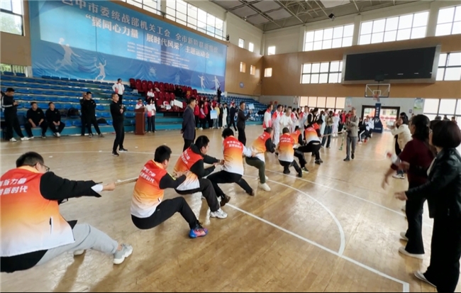 午后的“同心系列”趣味项目,将活动氛围推向高潮。同心接力赛上,队员们手持筷子稳夹乒乓球疾跑穿梭,速度与耐心的平衡考验着每一位参赛者;同心同行项目中,五人绑腿并肩前行,整齐划一的口号声里凝聚着“心往一处想、劲往一处使”的协作力量;同心同圆环节,队员们手拉手传递呼啦圈,灵活的身姿与默契的配合相映成趣,欢声笑语此起彼伏;同心拔河赛场,双方队员紧握长绳、脚蹬实地,嘶吼声与加油声震耳欲聋,三局两胜的激烈角逐中,尽显新阶人士坚韧不拔的韧劲与敢打敢拼的豪情。赛场上,选手们奋勇争先、互助鼓劲;赛场下,大家交流经验、共话发展,运动的激情与联谊的温情在体育馆内交织交融,绘就出团结奋进的生动图景。
