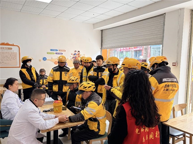 11月17日,该社区联合资阳市雁江区芝鹤社会工作服务中心举办的“‘惠’聚新力量,健康伴我行”主题活动,为40余名美团外卖骑手提供免费健康检测与急救知识讲座。安岳县第三人民医院主任医师团队现场为骑手测量血压、血糖,结合其工作特点进行健康评估,并针对性提出饮食调整与定期监测建议。