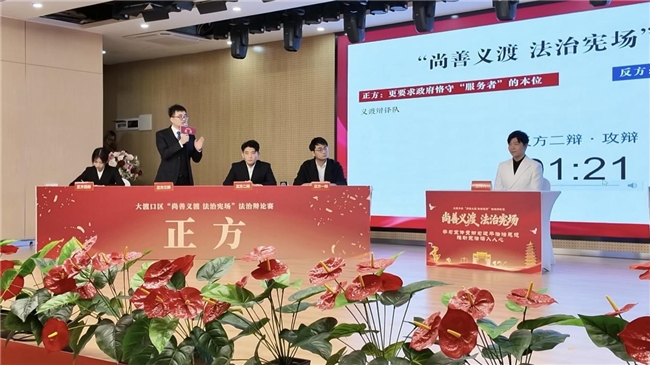 “请问对方辩友,如果只重监管、轻服务,企业面对繁琐审批和过高门槛,如何能轻装上阵、大胆创新?”“那么请问,如果只讲服务、放松监管,诚信企业何来公平发展的环境?”......12月4日下午,在重庆市大渡口区育才小学红旭校区,一场关于优化营商环境中政府角色定位的法治辩论赛正激烈展开,双方辩手犀利发问、金句频出,引得现场掌声不断。
