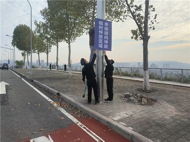 工作人员先后3次深入钓鱼嘴公园周边道路开展实地调研,统计现有车位缺口,分析周末高峰时段车流、人流运行规律,最终敲定“划设临时停车区”的解决方案——将钓鱼嘴17号路、钓鱼嘴大道南段划定为周末临时停车区域。
