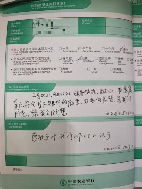 整个过程让林先生深受触动。业务办理完毕后,他激动之情溢于言表。他特意要求拿出客户意见簿,工工整整地写下了发自肺腑的评价:“服务好,耐心,有温度……”。林先生对农行急客户之所急、想客户之所想的优质服务表达了高度认可和由衷赞赏。该行表示将践行“以客户为中心”理念,为两岸同胞提供更优质金融服务体验。(张茜)