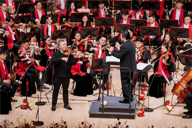国际经典作品成为当晚亮点。孔祥东演绎的格什温《蓝色狂想曲》,将古典结构与爵士精神自然融合;小提琴大师马克西姆·文格洛夫先后演奏《茨冈狂想曲》《沉思曲》,以精湛技艺和深沉情感赢得全场掌声;男中音廖昌永带来《斗牛士之歌》《天边》,在中西作品的转换中展现出宽广的艺术张力。