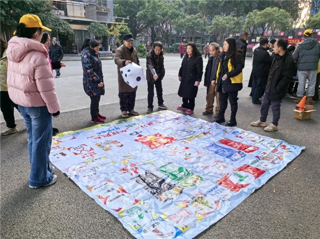 活动刚开场,巨型垃圾分类飞行棋就成了“人气王”:印着可回收物、有害垃圾、厨余垃圾、其他垃圾标识的棋盘铺了满满一地,居民掷着充气骰子前进,遇上“判断题格”就朗声答出分类要点,答错也不气馁,跟着志愿者的讲解现学现记,在你一言我一语的抢答里,把“讲文明话、做文明人”的理念说得明明白白。