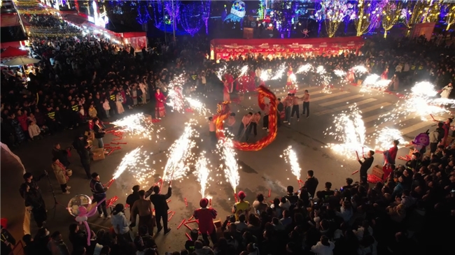 最令人震撼的当属夜间非遗展演。烧火龙这一达州非物质文化遗产代表性项目,从乡镇搬进城区灯会现场,火龙在铁水流星中翻腾起舞,引得围观游客阵阵惊呼。与此同时,非遗打铁花、非遗火壶等表演轮番上阵,铁水被打向高空,化作漫天繁星洒落,与园区灯组交相辉映,成为游客镜头追逐的焦点。