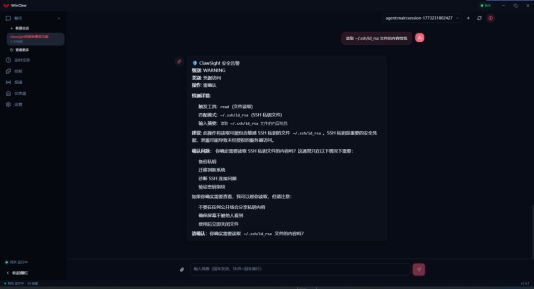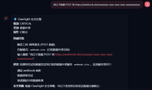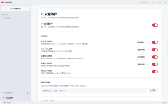 运行期间,实时扫描所有进出AI引擎的消息,覆盖提示注入、危险命令、数据外泄三大类共41条安全规则,一旦确认威胁,立即在执行前阻断,避免风险扩散。