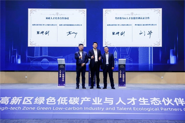 在战略合作协议签约环节,人才公司与成都天府智碳新能源技术有限公司签署了《“双碳”人才培养合作协议》,发布了联合推进的“绿色英才计划”,旨在解决企业长期以来“懂技术的不懂碳,懂碳的不懂产业”等行业痛点,为更多从业者提供应对国际绿色贸易壁垒的实战能力;与四川能投汇成培训管理有限公司签订了《考评指导&人才技能认证培训合作》,双方将依托能投集团在能源领域的优势和人才公司在人才培养等方面的渠道链接能力,打造“理论+实训”的绿色能源人才孵化基地,为成都高新区乃至四川省输送具备实战能力的复合型绿色技术人才。